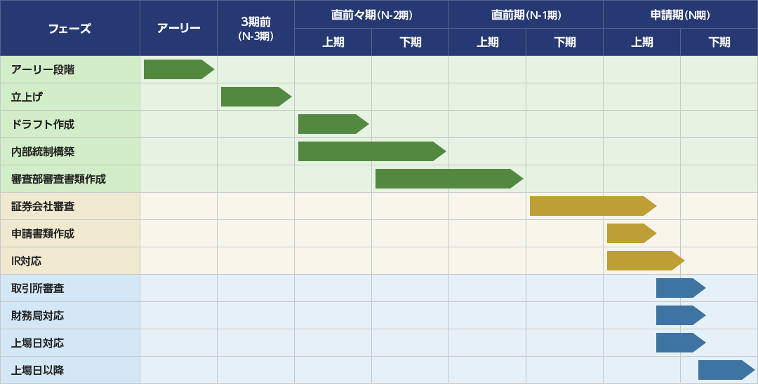 本格的な上場準備に入る前の検討段階から、各種ガバナンス整備、上場直前、そして上場後のサポートまで。